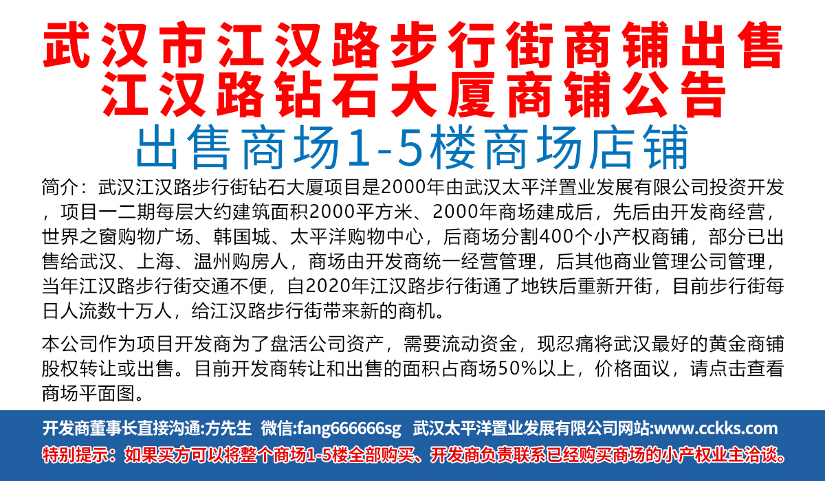 2000年在武汉江岸区,投资开发了江汉路步行街的高级商业居住项目,钻石大厦,投资规模1到5楼商场,6到18楼130套高级公寓。